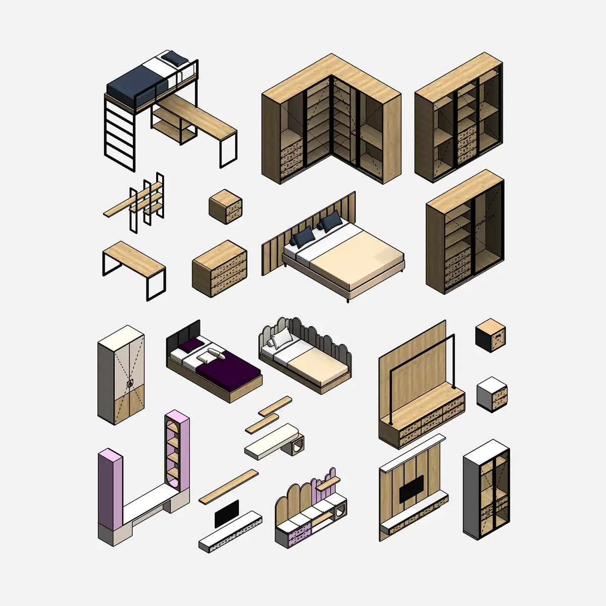 20 famiglie Revit leggere e pronte all'uso, LOD 300, per la progettazione di camere da letto, completamente parametriche e editabili.