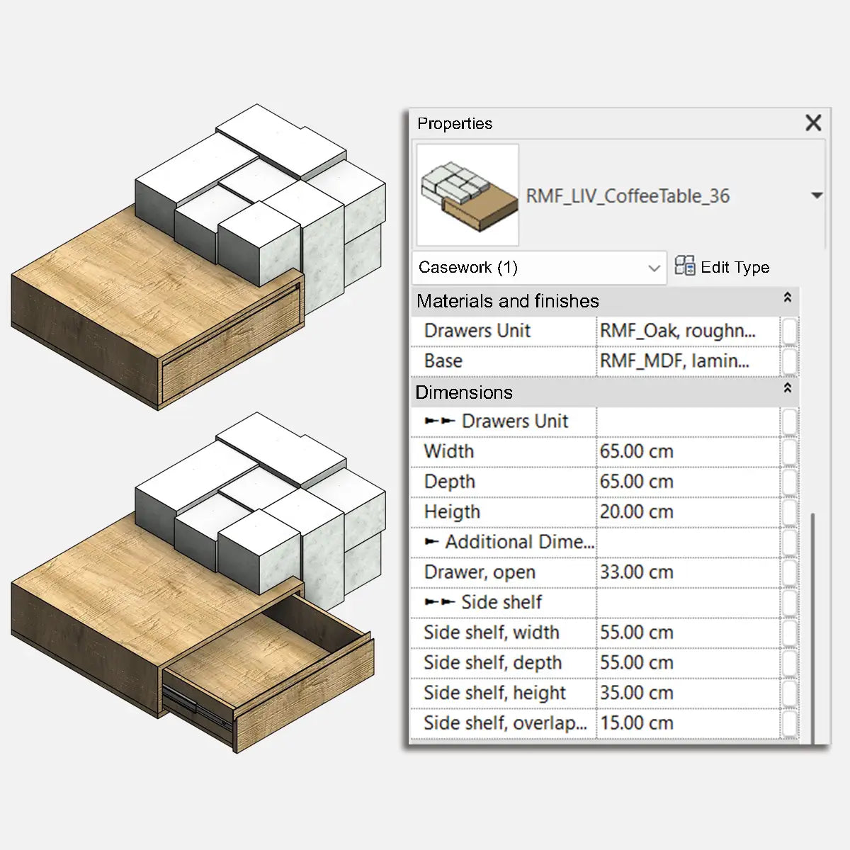 Ogni coffee tables è progettato per essere leggero e facile da usare direttamente nel flusso di lavoro di Revit. Usa le famiglie per mostrare viste pronte per il cliente o perfezionare i tuoi set di documentazione, risparmierai ore di modellazione personalizzata, consentendoti di concentrarti sulla creatività e sulla consegna efficiente del progetto. Soluzione intelligente ed elegante per architetti e interior designer che desiderano maggiore controllo, più dettagli e un valore estetico superiore. Utilizza i parametri di visibilità e dai spazio alla tua creatività.